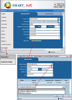 Automatic transfer and interface to HUMAN CAPITAL MANAGEMENT BIODATA modules. If the applicant is successful the real time database engine will update the personal record to HUMAN CAPITAL MANAGEMENT BIODATA modules with a mere click of a button