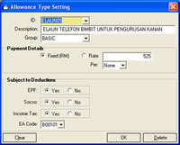 User definable allowances/deductions which are taxable, obligated EPF, SOCSO, EA and Overtime